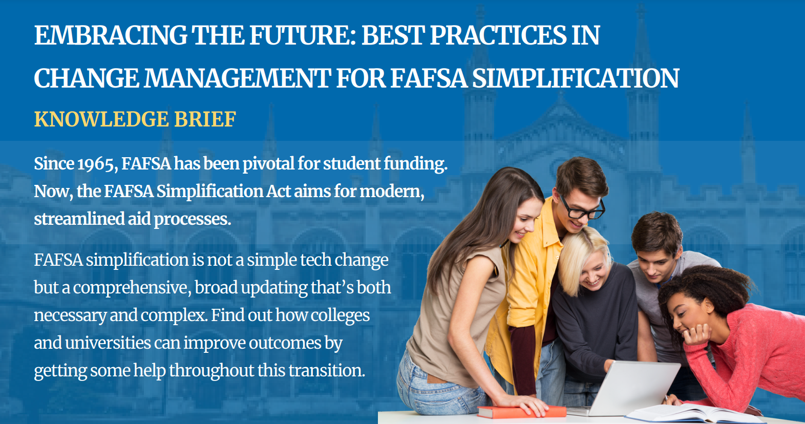 FAFSA simplification is not a simple tech change but a comprehensive, broad updating that’s both necessary and complex. Find out how colleges and universities can improve outcomes by getting some help throughout this transition.