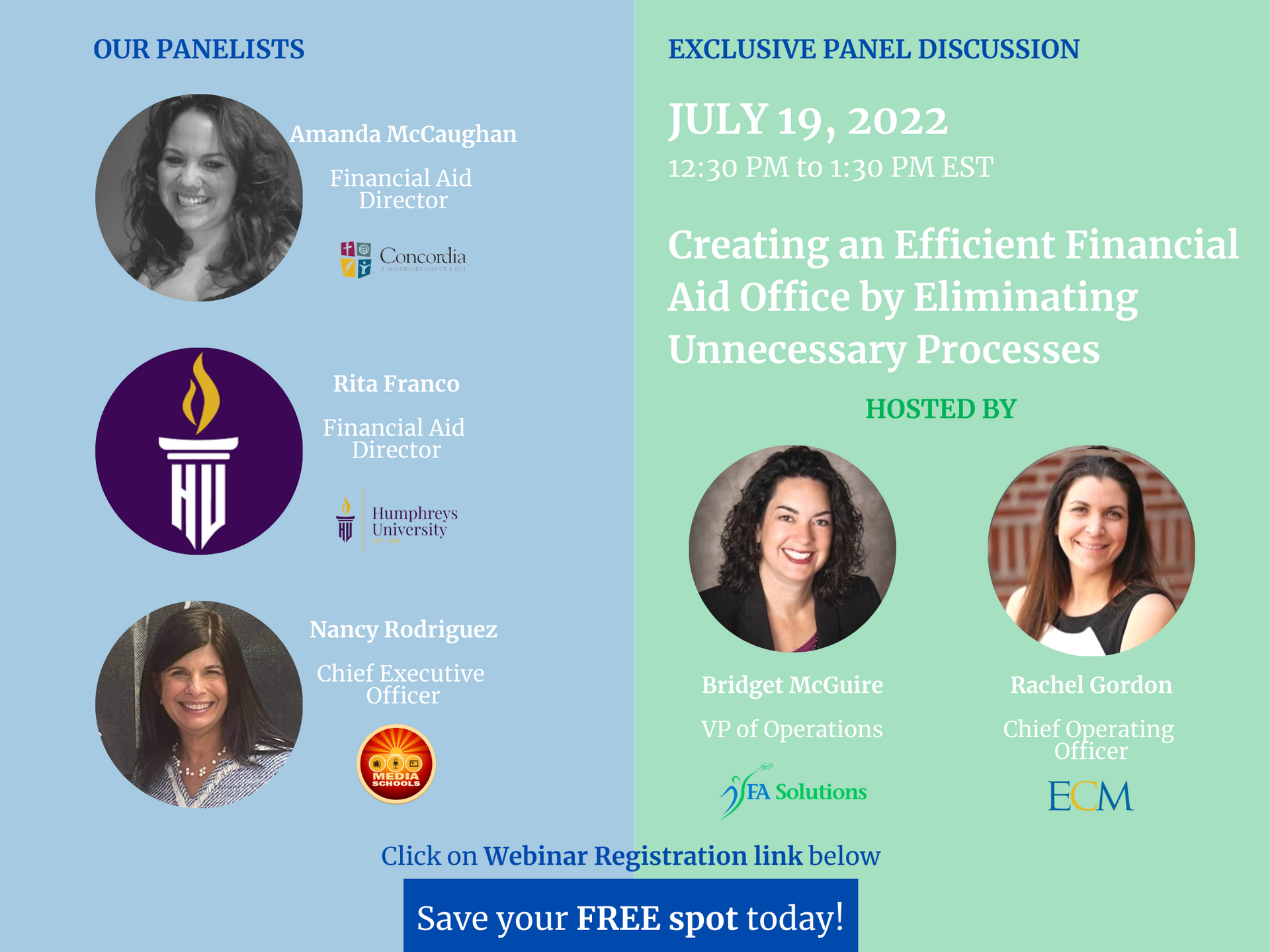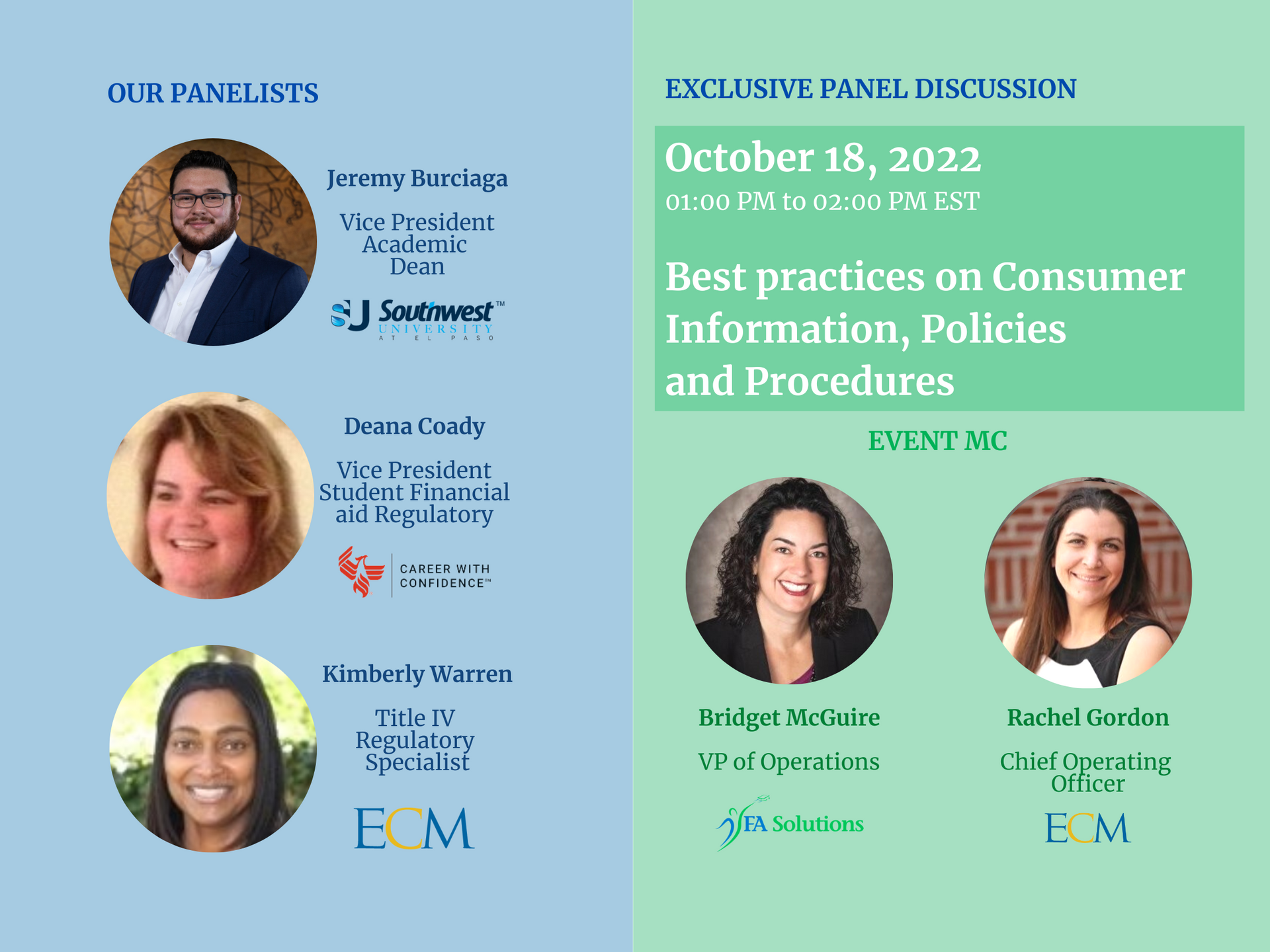 Exclusive panel discussion with Amanda McCaughan, Director of Financial Aid, Concordia University – St. Paul, Rita Franco, Financial Aid Director, Humphreys University, Nancy Rodriguez, Chief Executive Officer, BeOnAir Network of Media Schools, Bridget McGuire, VP of Operations, FA Solutions LLC and Rachel Gordon, Chief Operating Officer, Educational Compliance Management Inc.